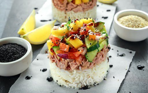 - Montar el arroz de base, encima el pescado y coronar con las hortalizas aliñadas.